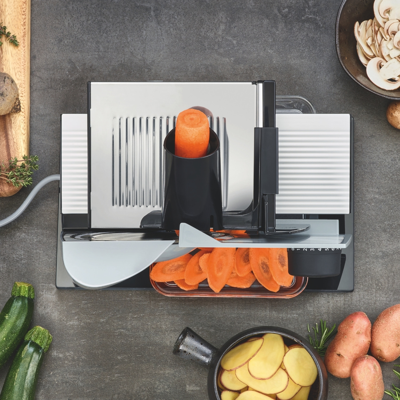 Durch die 15° Schrägstellung kann das Schneidgut durch die Schwerkraft ohne Berührung mit dem Motorkörper gleich in eine Schüssel, auf die Bodenplatte oder sogar direkt in den Topf fallen und das Ganze, ohne dass die Hand dem Messer je zu nahe kommt. Das Schneidgut drückt sich letztlich ohne Zutun an den Anschlag, sodass die Lebensmittel schnell und sicher in feine Scheiben geschnitten werden können.